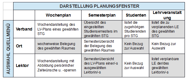 Je nach gewählter Registerkarte im Quellmenü (QM) werden im Planungsfenster spezifische Informationen dargestellt: